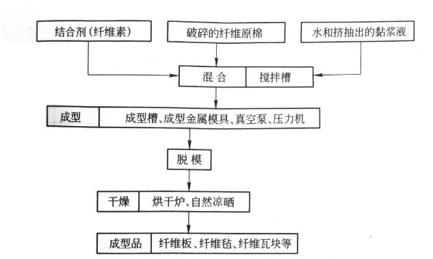 所謂陶瓷纖維板的濕法真空成型工藝,首先將纖維原棉切割成適合級(jí)配的碎塊,混配成漿狀放入定尺的金屬模內(nèi),金屬模壁上設(shè)有排水的小孔并與真空泵相連。金屬模內(nèi)襯要放入尼龍網(wǎng)紗,以便在擠壓和抽真空時(shí)擋住纖維棉溢出。成型產(chǎn)品的厚度可根據(jù)抽力和擠壓力來調(diào)節(jié),工藝如下圖。